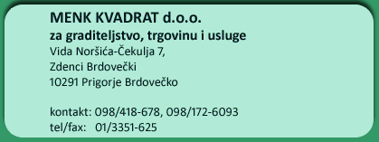 MENK KVADRAT d.o.o. je poduzeće osnovano 2004. godine sa sjedištem u Zdencima Brdovečkim. Osnovne djelatnosti poduzeća su iznajmljivanje, servis i prodaja profesionalnih ručnih alata, u čemu imamo dugogodišnje iskustvo.